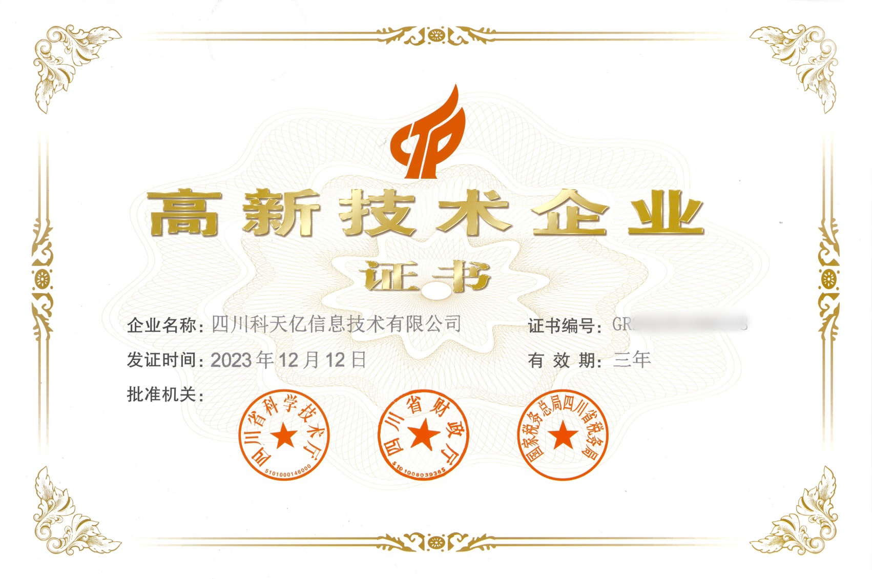 高新技术企业证书